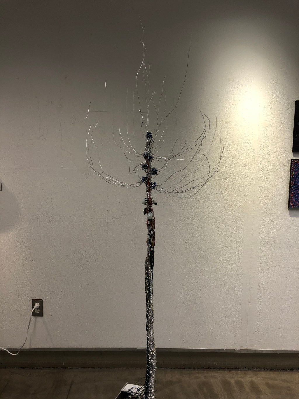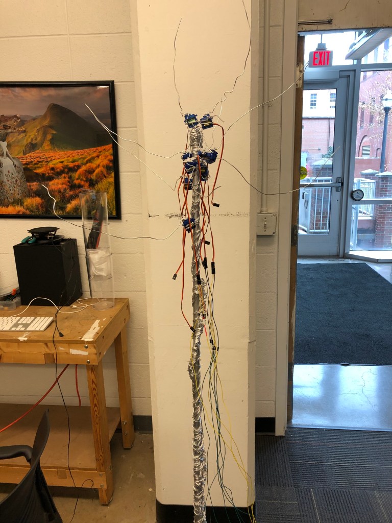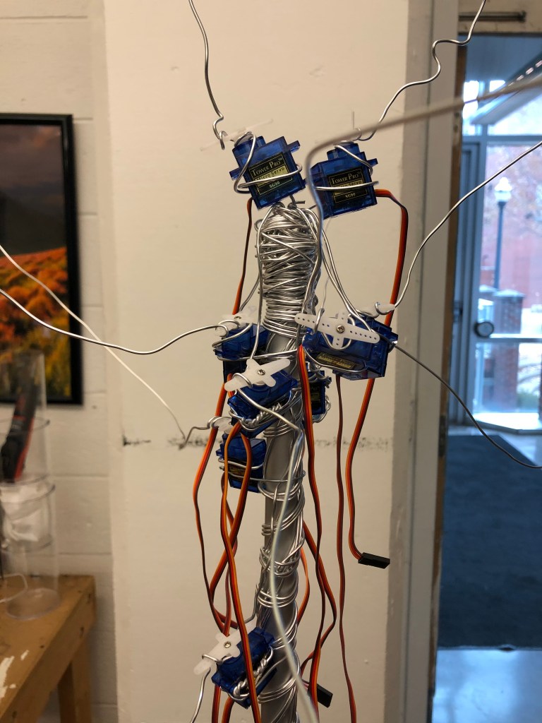 I used the cylinder of a floor lamp to be the backbone of my sculpture. I have installed ten servo motors and five PIR sensors: each sensor will control two motors. I still need to solder more electronic wires and add more metal wires to the sculpture.